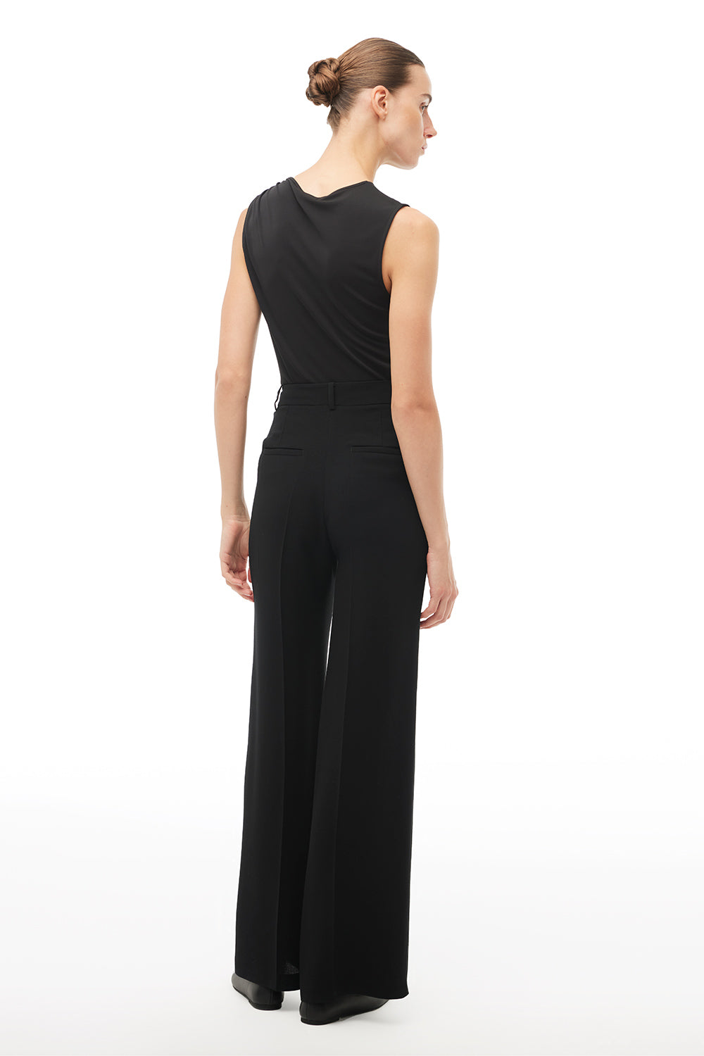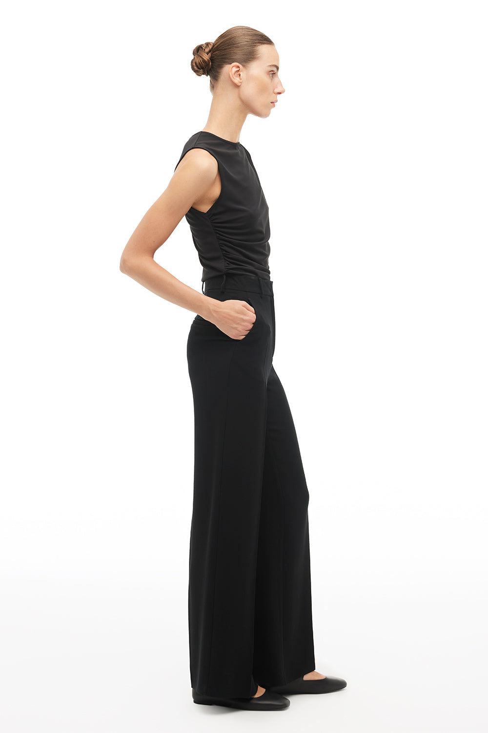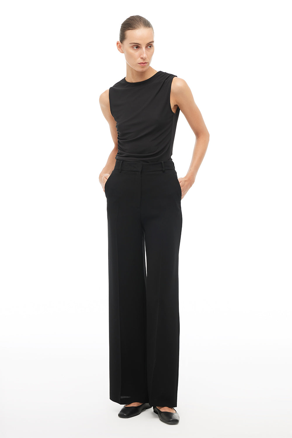 Pantallona të zi që plotësojnë setin e kostumit, me linja të pastra dhe formë klasike. të përshtatshme si të vishen me xhaketë në komplet, ashtu edhe veçmas me bluza apo triko.