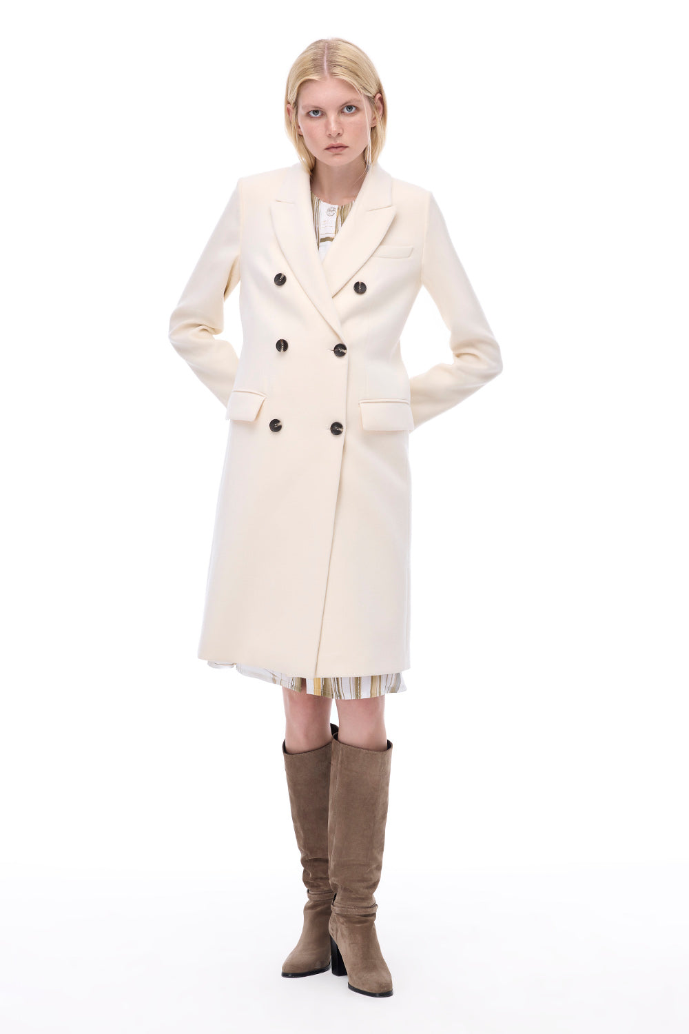 Kjo pallto ecru sjell një pamje të butë dhe të ndritshme, me siluetë të rregullt dhe stil minimalist. një zgjedhje elegante për kombinime të thjeshta dhe neutrale.