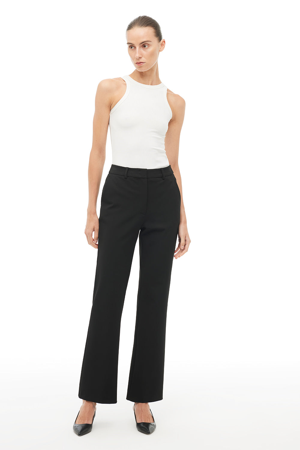 Pantallona të zezë me prerje të drejtë dhe pamje të rregullt, perfekte për veshje zyre dhe kombinime më formale. linjat e pastra i japin një stil modern dhe të përhershëm.