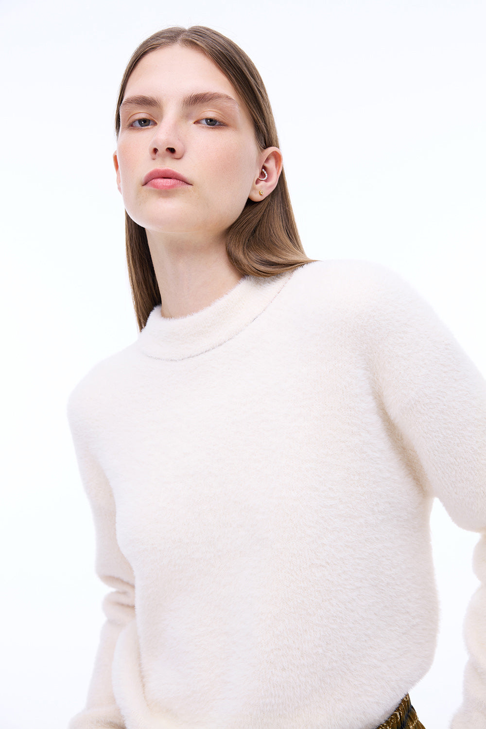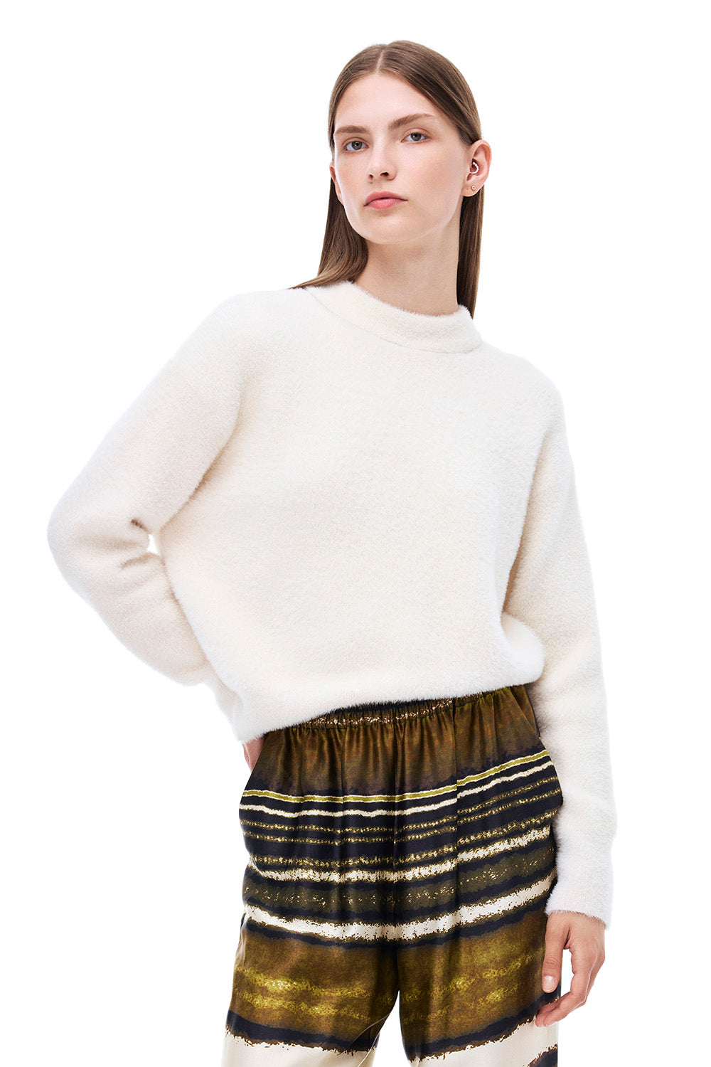 Kjo triko ecru ofron një pamje të butë dhe neutrale, me një strukturë të lehtë që vishet natyrshëm dhe lehtë. është e rehatshme dhe e kombinuar pa mundim me çdo veshje.